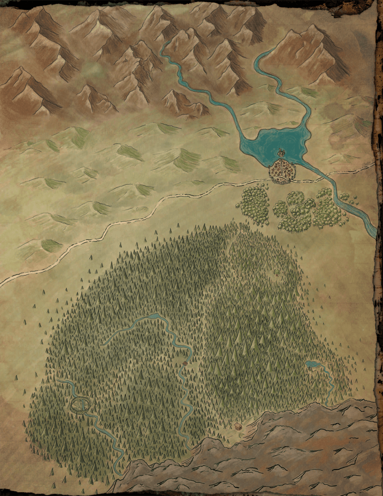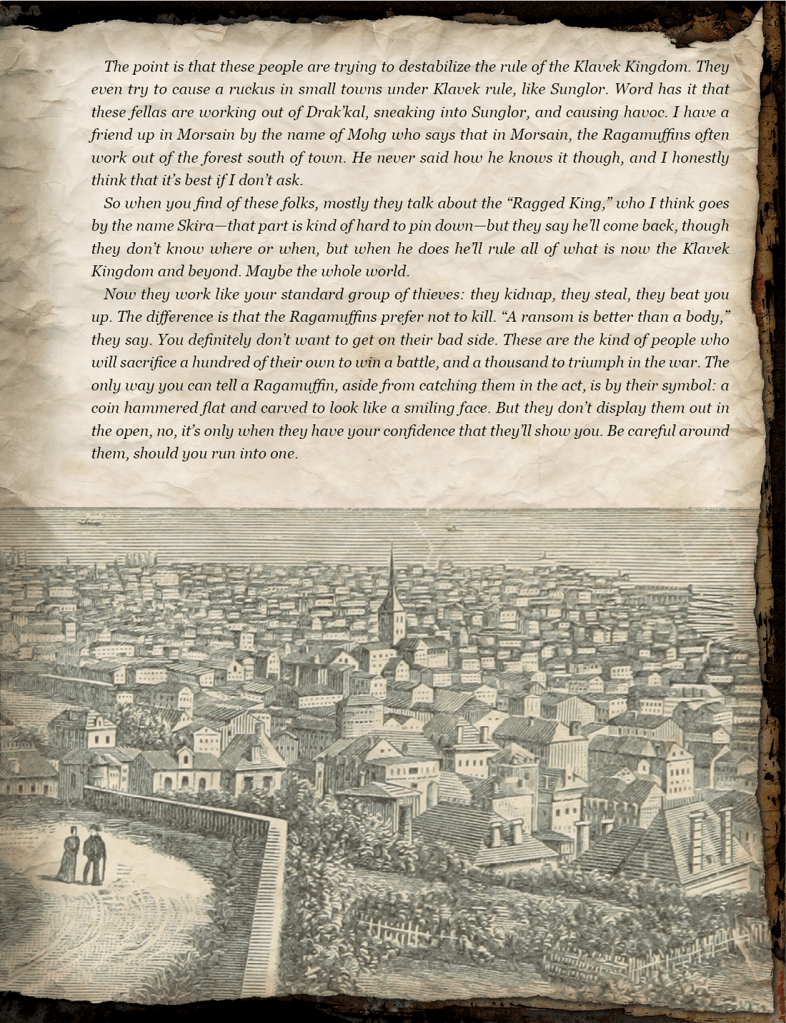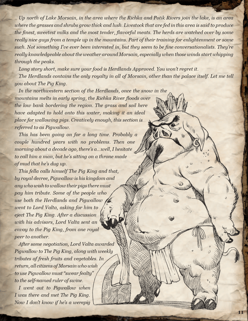 This was a supplement to the Snow White adventure. The book was meant to be an in-universe guide given to player characters about the town of Morsain and the surrounding area, so it needed to look like it might belong in the universe of Snow White. I created the parchment paper background myself, using scans of physical materials; I also had the chance to commission several pieces of unique artwork for this book from Mates Laurentiu.