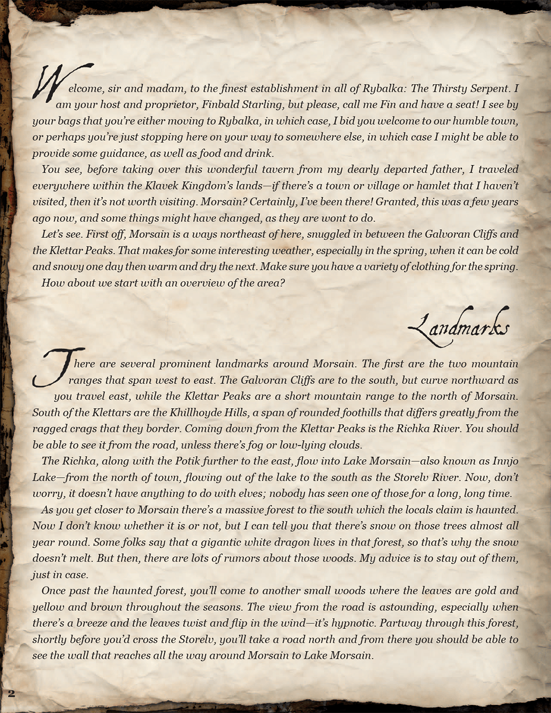 This was a supplement to the Snow White adventure. The book was meant to be an in-universe guide given to player characters about the town of Morsain and the surrounding area, so it needed to look like it might belong in the universe of Snow White. I created the parchment paper background myself, using scans of physical materials; I also had the chance to commission several pieces of unique artwork for this book from Mates Laurentiu.
