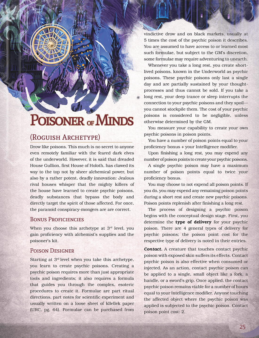 A sequel to Underworld Races and Classes, this book gave players and Game Masters more options to work with. I refined the design techniques I’d learned from my work on Underworld Races and Classes, and incorporated some new elements. For instance, I created the emblems on each splash page using Adobe Illustrator.